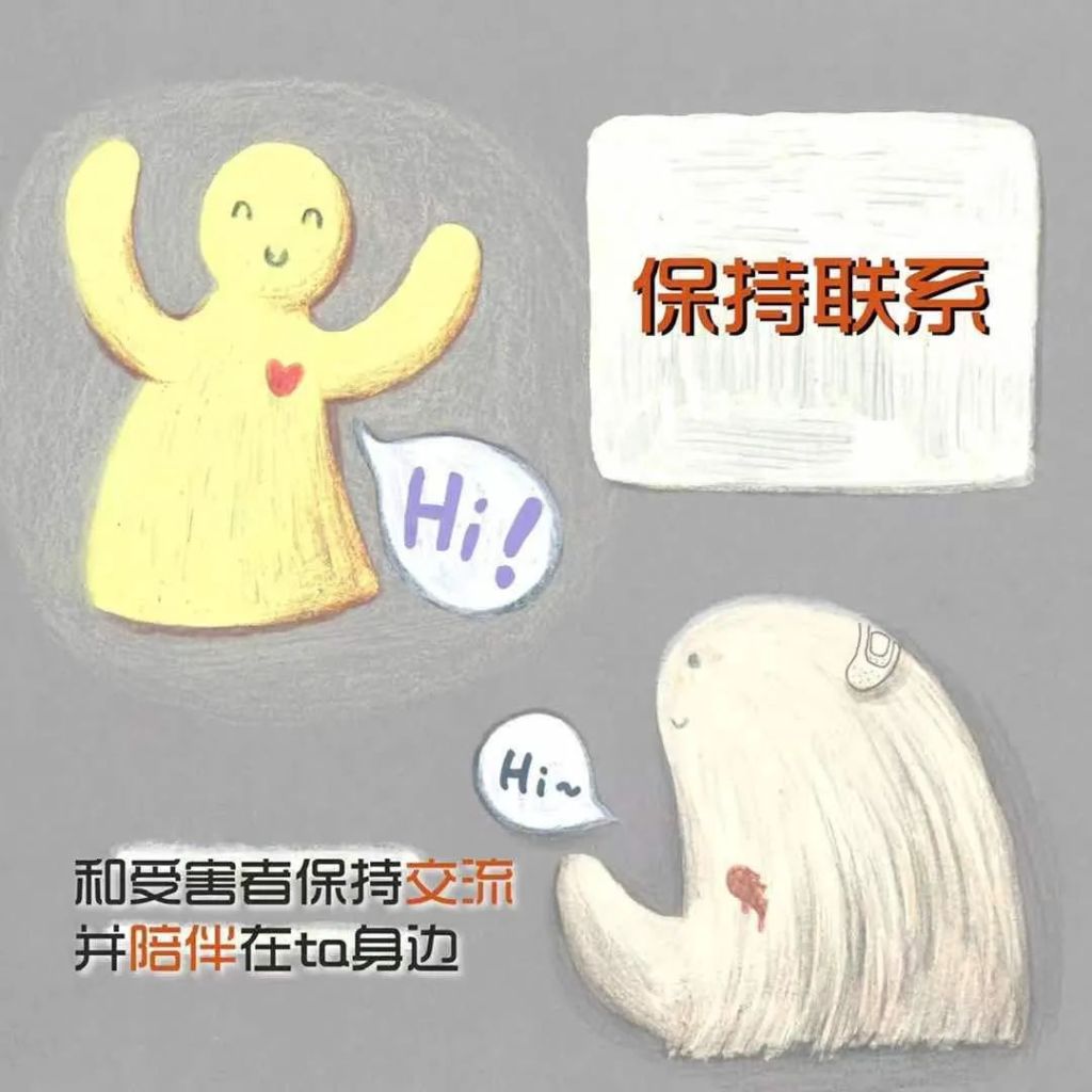 和当事人保持交流并且陪伴在ta身边。你和ta的联系就是当事人的救命索。