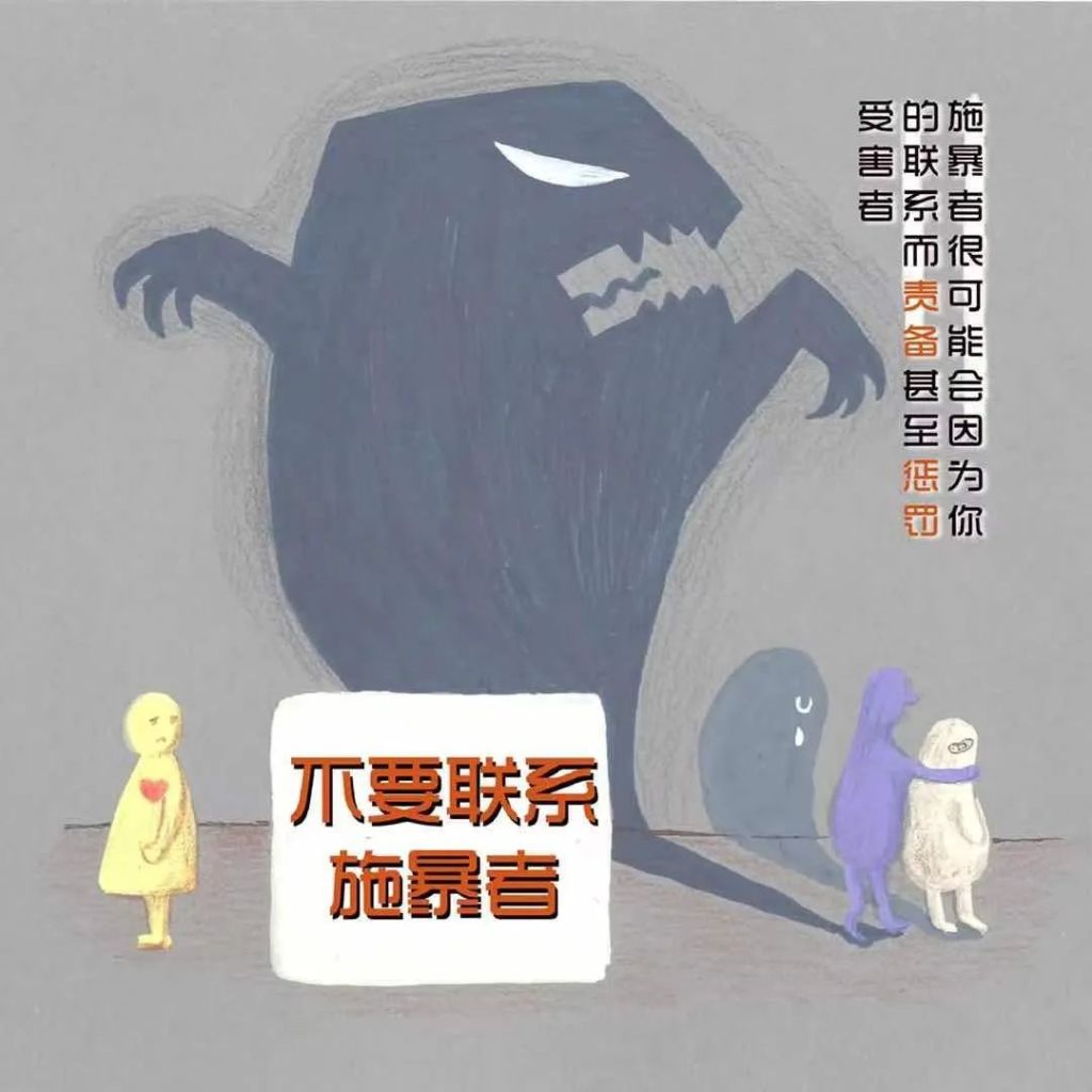 图片说明:家暴者搂着家暴受害者,家暴者的阴影很大,仿佛一个长着巨口的怪兽,受害者的阴影在哭泣。助人者站在远处很担心。文字:“不要联系施暴者”“施暴者很可能会因为你的联系而责备甚至惩罚受害者”。