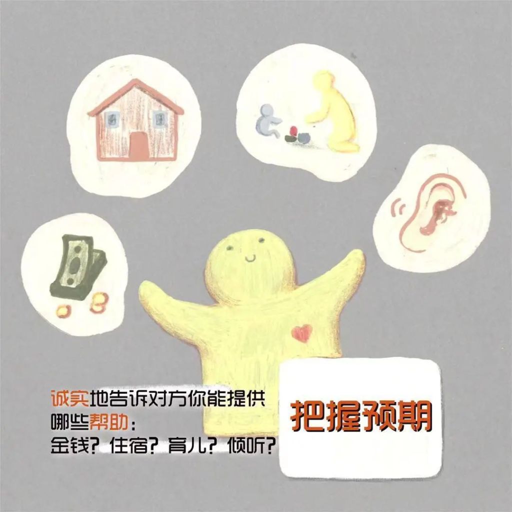 图片描述:助人者和ta能提供的帮助。这些帮助在气泡中的展示分别有金钱、住房、和孩子玩耍、倾听的耳朵。文字:“把握预期”“诚实地告诉对方你能提供哪些帮助:金钱?住宿?育儿?倾听?”。