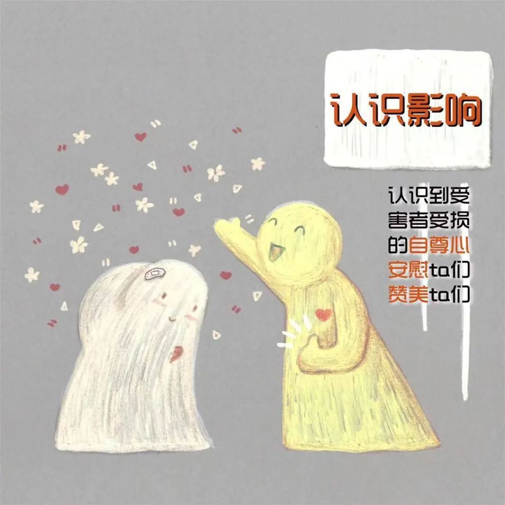 图片描述:助人者给家暴受害者撒花和爱心。助人者还比了大拇指表示鼓励和赞美。受害者挠挠头有些害羞。文字:“认识影响”“认识到受害者受损的自尊心,安慰ta们,赞美ta们”。