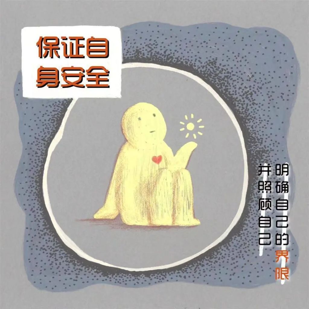 图片描述:助人者正坐在地上,ta正看着手中的一束光。文字:“保证自身安全”“明确自己的界限并照顾自己”。