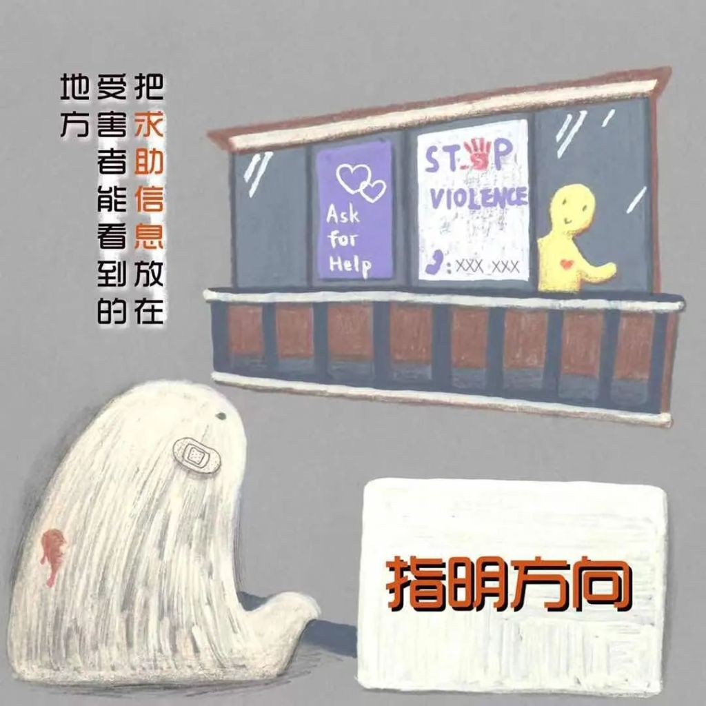 图片说明:助人者在ta张贴的两张海报旁边和家暴受害者挥手。一张海报写着“Ask for help【寻求帮助】)”,另一张写着“Stop Violence【停止暴力】”并有电话热线标志。文字:“指明方向”“把求助信息放在受害者能看到的地方”。