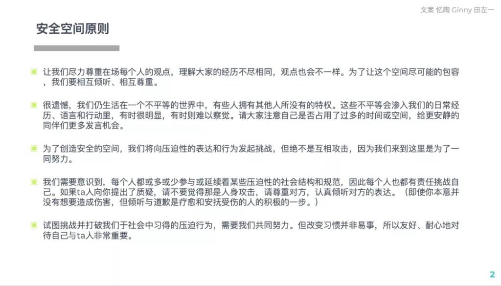 和我想象中很不一样的是,相比于学到更多自己能做什么,我好像更多是意识到了我们“不能做什么”。从安全空间的概念到反思自己身上的特权,我感觉女权理论给我更多的是一个对权力不关系更敏感的视⻆,能够更容易意识到自己在一些场合中其实比别人拥有更多的权利或者说是自由,因此才能够更好察觉到别人的需求来避免自己的可能“无意之中”对别人造成的伤害或者不适。正是如此,和一群素不相识的人一起,大家却能够很敞开的去聊一些比较personal的话题,甚至是生活中的darkside,不用担心别人怎么看你会不会judge你。
