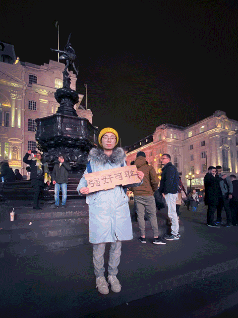 我们在伦敦眼、中国城、地铁站和皮卡迪利广场,举起我们的声援横幅和海报。我们希望让更多的人看到我们对她的支持。